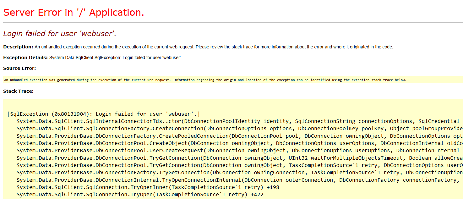 Exception Details: System.Data.SqlClient.SqlException: Login failed for user 'masteruser'.