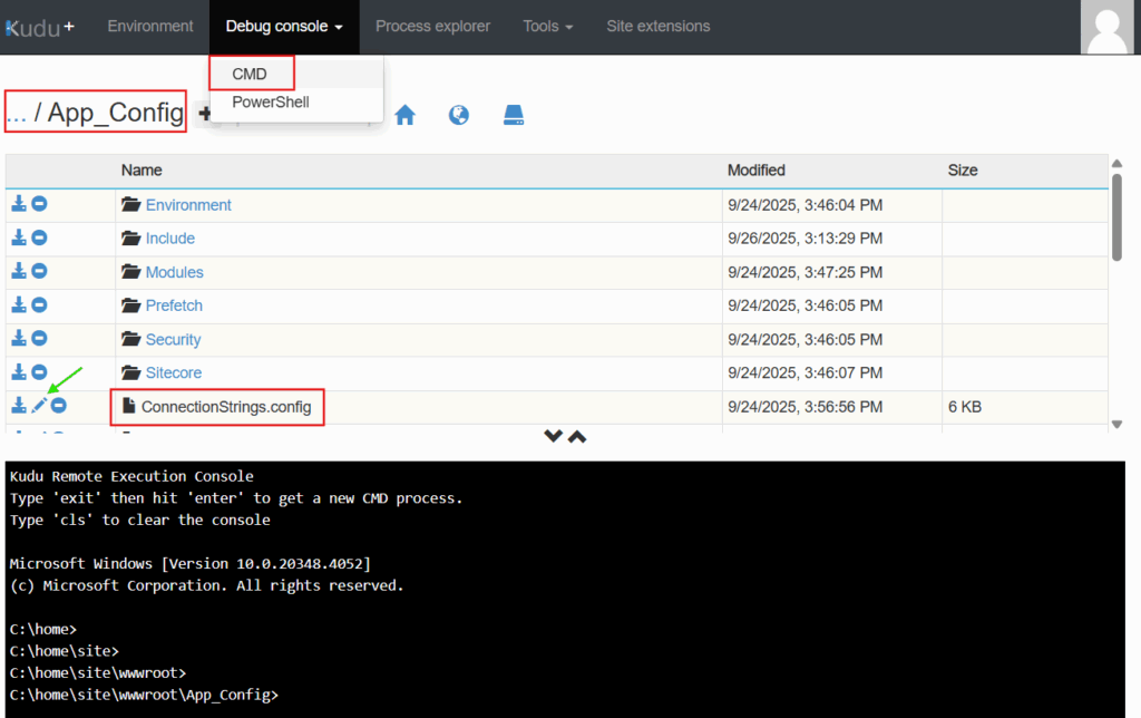 - Go to the ConnectionStrings.xml of your App Service using Kudu from App > Development Tools > Advanced Tools, and reach out to this address:
