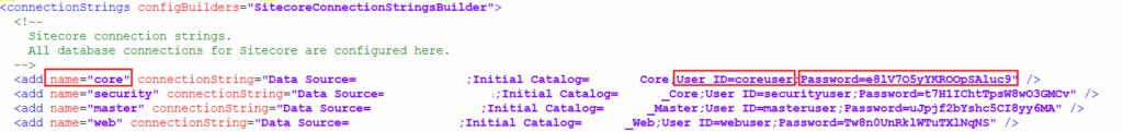 - Locate the <add name=”…” element corresponding to your database user (e.g., masteruser, webuser, securityuser) and copy the password.